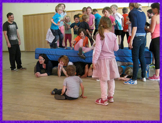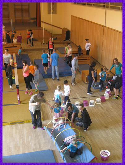 Am Sonntag, 19.April 2015 fand unser großer Bewegungstag in der Turn-und Festhalle Rheinzabern statt. Eingeladen waren alle Familien der Kita Faustina mit Freunden und Interessierten. Wir hatten alle Räumlichkeiten der Turn-und Festhalle ausgenutzt um möglichst viele Bewegungsmöglichkeiten und Bewegungserfahrungen zu ermöglichen. Im Proberaum der Musiker und Sänger fand unser Yoga-Workshop statt. Im Speisesaal konnte man die elementaren Inhalte der Psychomotorik begreifen und erleben. Bei schönstem Sonnenwetter wurde auch die Spielwiese für bewegtes Lernen im Freien genutzt und die große Halle wurde in eine riesige Gerätelandschaft umgebaut, die Groß und Klein zum intensiven Bewegen und Spielen einlud.