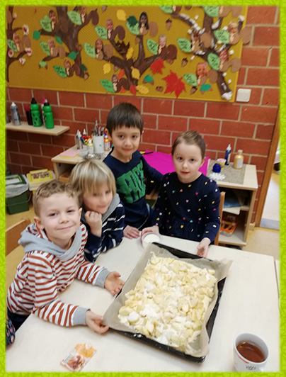 Es werden Vor-, Haupt- und Nachspeise angeboten. Die Kinder werden motiviert alles zu probieren, es gibt jedoch keinen Zwang und auch keine Verbote beim Nachtisch, wenn ein Kind etwas nicht probieren oder essen möchte.